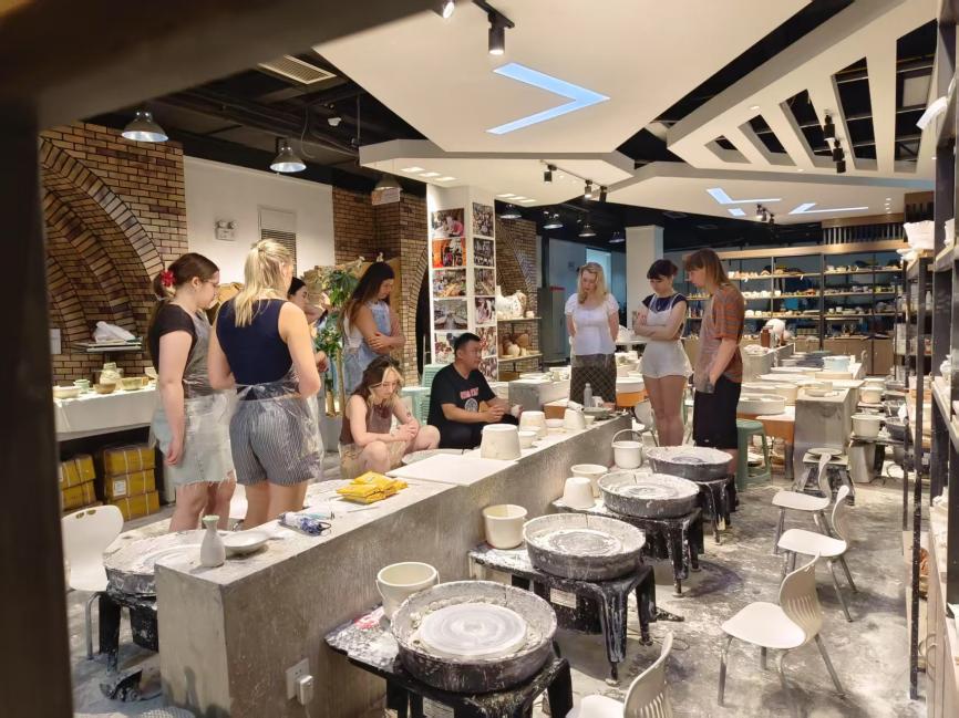 The second stop was the Dream Studio of Ceramic Art, the first specialized ceramic art innovation and entrepreneurship dream studio led by materials science in China. The School’s faculty guided the students through the hands-on rooms and exhibition halls, explaining the application scenarios of ceramics and introducing the research and development achievements of ceramic cultural and creative products. The students also appreciated a wide array of ceramic creative works. The narration of Chinese cultural stories promoted the concept of Chinese ceramic culture and brought Chinese and British teachers and students closer together. During the explanation, the teachers combined the development history of the Dream Studio of Ceramic Art. They introduced the ceramic-making process and principles from various disciplines and technologies, such as ceramic materials science, art design, and 3D printing/ scanning, allowing the teachers and students to deeply experience the magical charm of the natural kiln transmutation and the profound ceramic culture. Subsequently, teachers and students from the Ceramic and Art Association explained the techniques and key points of pottery making, conducting teaching demonstrations and skill explanations. Under their “step-by-step” meticulous guidance, the students began to take bold attempts and immersed themselves in various pottery techniques during the activity, creating a lively and enthusiastic atmosphere.