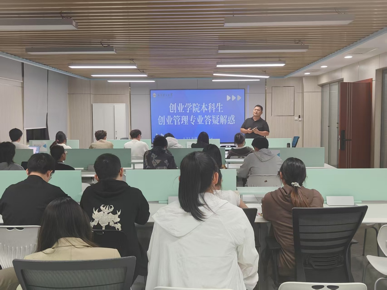 To effectively address the undergraduates’ questions about academic planning and career development in the Entrepreneurship Management major—and to help students clarify their professional positioning and define their growth paths—on the evening of April 13 the School of Entrepreneurship held a Q&A session for the Entrepreneurship Management major in Room 406. The meeting was chaired by student counselor Jia Yingdi and featured Associate Professor Liu Zhenyuan, Chair of the Entrepreneurship Management Department, as the keynote speaker. All undergraduates in the major were in attendance.